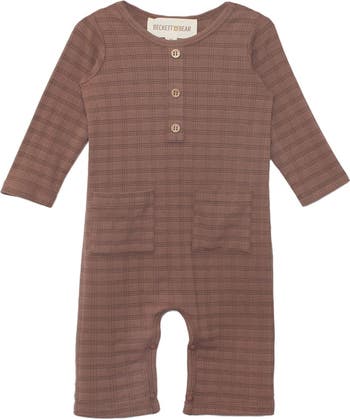 - The Theo romper's subtle brown checkered pattern and thoughtful details offer a timeless look. Designed for all-day comfort, it features long sleeves, three centered chest buttons, and two front pockets for a practical yet polished finish. This versatile piece is perfect for keeping your baby boy stylish and cozy, making it an ideal staple for any wardrobe. Fabric Content & Care 63% POLYESTER 32% COTTON 5% SPANDEX Machine Wash Cold