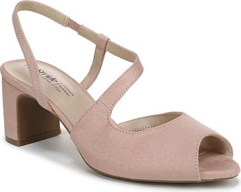 An asymmetric strap and peep toe add stunning dimension to a slingback pump lifted by a half-moon block heel. Soft System® comfort technology delivers underfoot cushioning and a flexible traction sole.