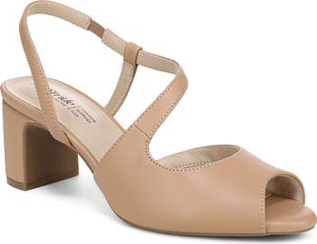 Asymmetric cutouts and a peep toe add allure and dimension to a slingback sandal lifted by a modest block heel. A cushioned footbed and traction sole deliver optimal comfort and stability.