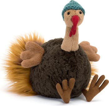 A soft beanie and outstretched wings add adorable charm to a plush turkey that's ready for warm and cozy snuggle sessions with your little one.