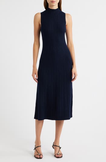 Cable stitches add touchable texture to a wool-enriched sweater-dress knit in a flared, sleeveless silhouette and topped with a polished funnel neckline.