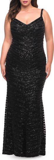 Gorgeous long plus gown with thick line sequin print fabric. V neckline and thin straps. Back zipper closure.