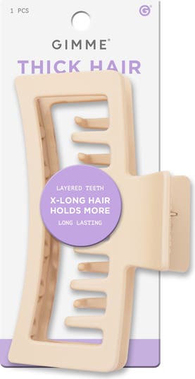 Take care of your hair with the Gimme Beauty XL Rectangle Double Teeth Claw Clip. Whether you have thick, curly, or fine hair, this extra-large claw clip delivers a strong, dependable hold with its precisely engineered double-layer teeth pattern. Its generous profile and signature velvet-like finish combine luxury and functionality, providing ample space for securing a variety of hair types and styles without slipping, snagging, or causing damage.Crafted with durability and sustainability in mind, this break-resistant clip is made from 30% recycled plastic, maintaining its shape and grip through daily use. The double teeth design expertly distributes pressure, offering non-slip control for thick and curly hair while remaining gentle enough for finer textures. Its versatile and elegant tan color makes it a stylish choice for every occasion, whether you're dressing up your ponytail, messy bun, or any creative hairstyle. Transform your routine with a hair accessory designed to protect hair health, provide lasting performance, and add effortless style to your everyday wear.At Gimme Beauty, we are a hair care brand with a mission to create a range of products that work for all hair types. Knowing hair solutions are not one size fits all. Each of you are unique, your hair care should be too. We celebrate your individual beauty and aim to elevate it with disruptive invention. Think of us as your go-to BFF for hair care. We'll give you the best advice, hype you up, and always make you feel comfortable in your own skin.We lean into the sisterhood created by our mutual experiences with hair. Where other beauty brands might value exclusivity or eliteness, we are all about inclusion and accessibility. Our goal is to amplify hair confidence, because we believe confident women are unstoppable.