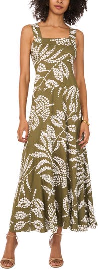 A vivid tropical print enhances the vacation vibes of this drapey tiered maxi topped with a sharp square neck and thick straps.