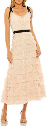 Soft lace tiers create beautiful movement in this midi dress, while dainty bow straps lend a sweet, feminine accent to its timeless, romantic design.