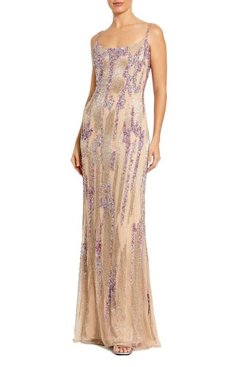 Dazzling sequins and delicate thin straps bring sleek sparkle to this mesh gown, perfect for any formal occasion.