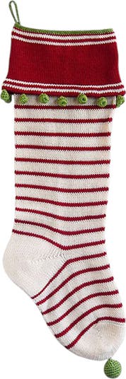 This stocking showcases a delightful cream and red striped pattern that offers a timeless and festive look. The rich red cuff is accented with playful green pom-poms, adding a whimsical touch, while the matching green pom-pom at the toe provides a unique, eye-catching detail. Perfect for hanging by the fireplace, this stocking is as functional as it is decorative, offering plenty of room for treats, small gifts, and holiday surprises. The durable cotton weave ensures that this stocking will become a cherished part of your holiday traditions for years to come.