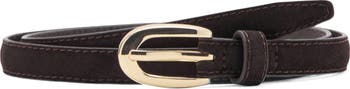 Tonal stitching and a polished metal buckle enhance the classic look of this slim belt crafted from supple suede.