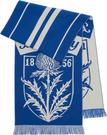 A scarf made in Italy from wool, woven with seasonal motifs and a cursive logo. Inspired by sports scarves, the design features the thistle shield, stripes, and the year Burberry was founded. ||Rectangular|Eyelash fringing at both ends|Woven Burberry lettering