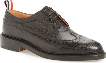 This essential derby is crafted of pebbled calf leather with classic broguing details and a logo pull strap at the heel.
