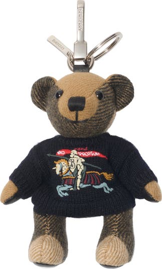 Our signature teddy charm in check cashmere, wearing a knitted wool sweater embroidered with a colourful take on our Equestrian Knight Design. The design features moveable arms and legs. This is not a toy and is intended for collectors of 14 years of age and above.||Brushed metal hardware|Engraved Burberry lettering at clasp