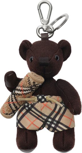 Our signature teddy charm in wool is beach-ready, dressed in Burberry Check swim shorts and carrying a matching towel. The design features movable arms and legs.