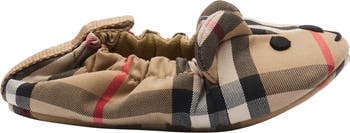 A pair of elasticated booties made from cotton woven with the Burberry Check in signature sand beige. The slip-on style has a soft leather insole and is embroidered with a three-dimensional Thomas Bear.||Rounded toe|Embossed Burberry lettering at insole