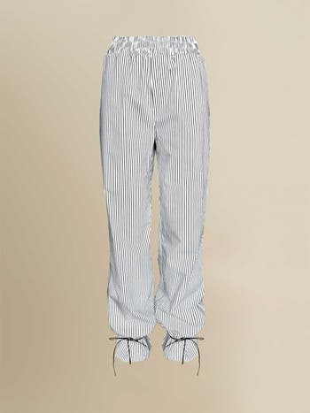 A relaxed striped pair of trousers with leather bows cinch at the ankle. Made in NYC.