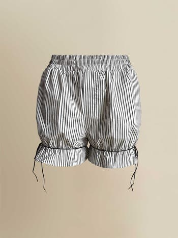 Striped bloomer shorts with an elastic waist and a leather tie around each leg. Made in NYC.