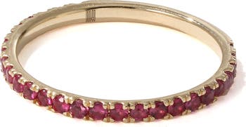 Light your stack up with vibrant color when you wear this slim band ring that dazzles with 27 faceted rubies.