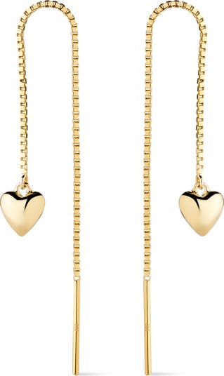 An elevated take on the classic threader earrings, this pair is destined to take your look to the next level. Plated in 14k gold, these earrings feature a classic threader silhouette with delicate chains and dangling puffy heart pendants.