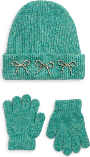 Keep your kiddo warm and comfortable all season long with this cozy set of a cuffed beanie with three sparkling bow accents and matching knit gloves.