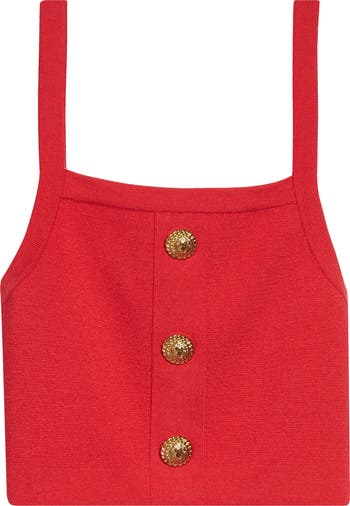Fiery reds are trending this season and this vibrantly hued sweater-knit tank with crest-embellished buttons offers a sophisticated way to incorporate the color into your wardrobe.