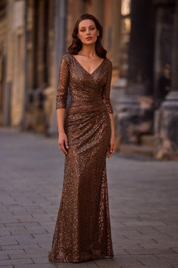Long sequin gown with V neckline and sheer three quarter sleeves. Ruching across front and back of dress. Back zipper closure.