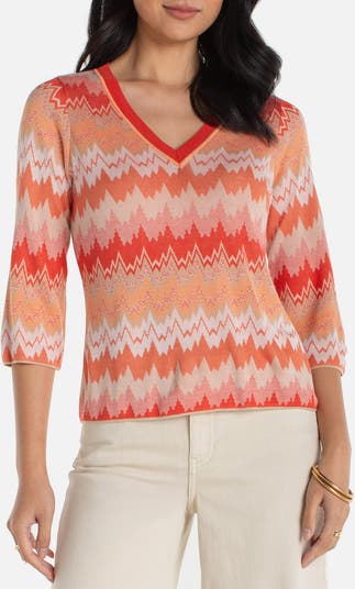 Vivid, jagged stripes energize this fine-gauge sweater framed by three-quarter sleeves.
