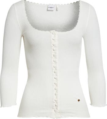 Engineered in ribbed cotton with natural give, this body-skimming top shapes the frame with quiet precision. Tonal buttons march the placket for a controlled reveal, and intricate lace traces the edges for a final touch of polish.