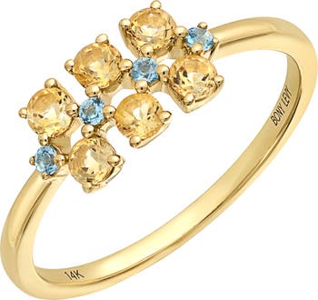 Triple rows of sparkling citrine and blue topaz stones shape the lattice-like pendant that anchors this delicate ring handcrafted from 14-karat gold.
