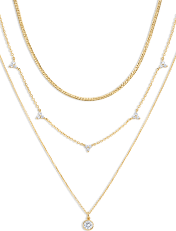 Three's a party. The Three Wishes Necklace has three unique chains that come together at a single clasp. The longest is a delicate chain with a singular round crystal in a gold setting; the center features seven clusters of three crystals arranged in triangles; the shortest is a thicker chain with small gold links. It's layering made easy.