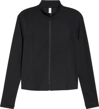 Stretchy ribbed knit construction brings a close, body-skimming fit to this lightweight zip-front sweatshirt designed to move easily from gym sessions to coffee runs.