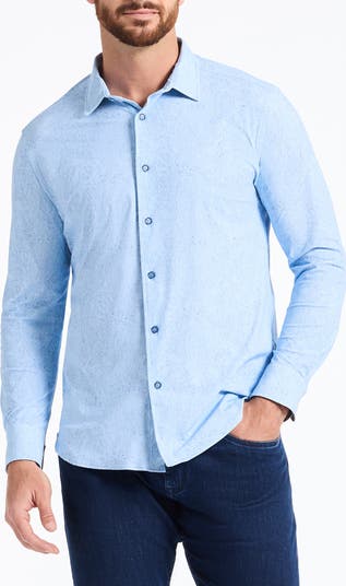 A lightweight motion-knit fabric lets you move unencumbered in a lightweight and stretchy button-up shirt rendered in a faintly sketched paisley pattern that works easily into your casual or more styled-up look.