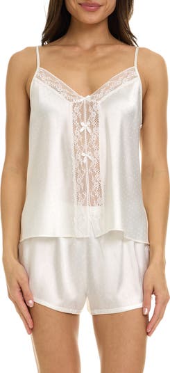 Lilts of lace and glossy satin combine to create a charming pajama set comprised of a V-neck cami paired with elastic-waist shorts.
