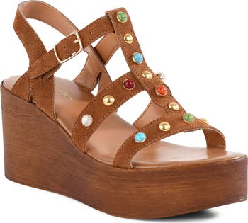 Polished dome studs and vibrant beads embellish the supple suede straps on an Italian-made sandal lofted by a woodgrain platform and integrated wedge heel.