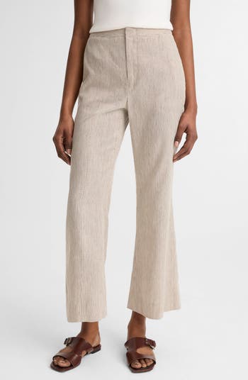 Great pair of light weight seersucker pants with a little bell flare! I am petite so the crop length is perfect for me. The reviews said to size up but I had to size down.