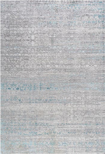 - Deep turquoise against a soft gray and ivory background gives this rug its contemporary strie' look
