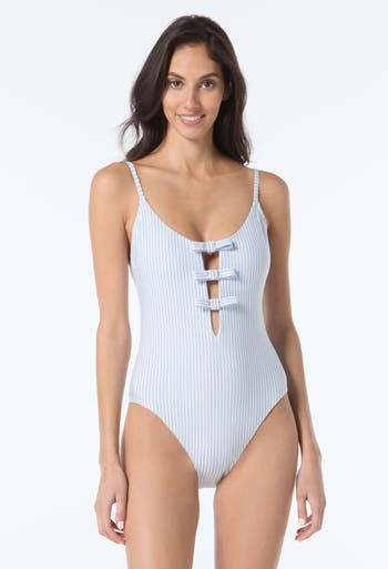 Because one bow is never enough! This striped one piece swimsuit features three bows on the front neckline for triple the fun. A seersucker, textured, summer stripe is coastal chic. Pair it with coordinating cover ups or denim shorts.