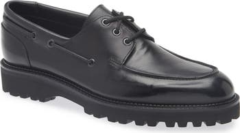 Refined materials and impeccable craftsmanship elevate a timeless leather boat shoe designed with a hand-stitched apron toe and flexible lug sole.