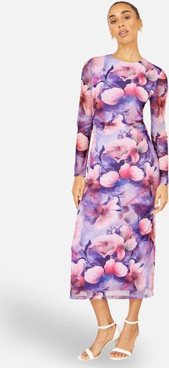 This striking midi dress is designed to make an impression, blending romantic florals with a contemporary silhouette. Crafted from lightweight mesh, it features a vivid watercolour-style floral print layered over a soft lining for comfortable coverage. The sleek, body-skimming fit is balanced by long sleeves and a high neckline at the front, while the open back with delicate tie detailing adds a dramatic, feminine finish.