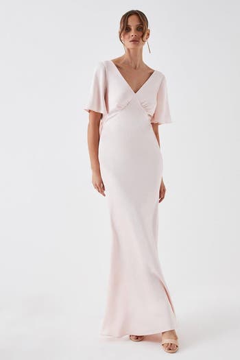 Experience elegance with our Tie Back Satin Bridesmaid Dress in blush. Perfect for bridal parties, this dress complements every silhouette.