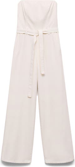 A tie belt shapes the silhouette of this nonstretch denim jumpsuit made with elongating wide legs and meant to show off your shoulders.