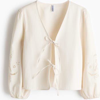 Jacket in cotton twill with a V-neckline and an open front with two pairs of ties. Featuring 3/4-length balloon sleeves with broderie anglaise and elasticated cuffs. Unlined.