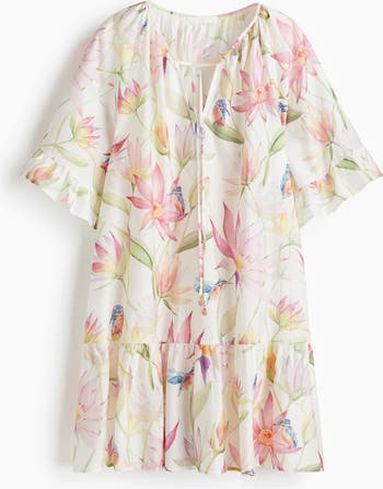 Short, loose-fit dress in a crêpe weave made from a lyocell blend. Round neckline with gathers all around and a V-shaped opening and narrow ties at the front. Elbow-length raglan sleeves with frilled cuffs and a gathered tier below the hips for added volume. Unlined.