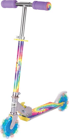 Take a ride on the new Tie Dye Scooter. This colorful scooter has Light Up PVC wheels that come on automatically when ridden. Lights go off when scooter stops moving., The adjustable height T-bar will make riding a breeze for all kids. This unique little scooter has an easy fold and lock mechanism making it easy to fold down and carry to the next ride. Rear foot brake. Assembled dimensions: 26 x 13 x 31.5". Weight limit" 110 lbs. Your kids will be the envy of the neighborhood on this spiffy scooter.