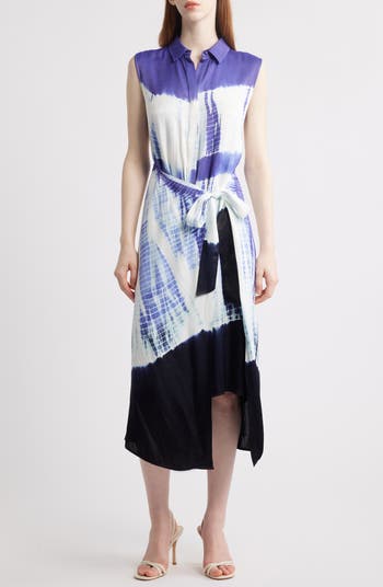 A drapey tie belt shapes this silhouette of this light and airy sleeveless shirtdress updated in a bold tie-dye print for a lively yet polished attitude.