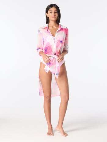 Effortlessly chic, this convertible shirt is the perfect piece to take from the beach to the street. Let it drape for a longer fit or tie the front for a convertible option. The floral print and pearl button down front add a luxurious splash of femininity.