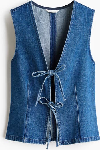 Fitted waistcoat in cotton denim with a V-neckline and two sets of narrow ties at the front.
