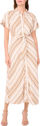 A sophisticated maxi shirtdress is updated in a breezy linen-kissed fabrication and framed by drapey dolman sleeves for a laid-back attitude.
