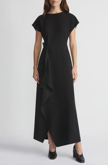 This ankle-grazing dress crafted from the label's signature Finesse Crepe reimagines a loosely tied gardening apron via a fluid draped panel at the front.