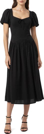A sweetheart neckline and delicate tie front accent define this puff-sleeve midi dress styled with a relaxed drop waist for a figure-flattering drape.
