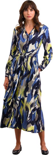Made from a light and airy fabric that drapes beautifully, this button through midi dress has a full, flowing skirt. It can be tied at the front or back, and features a v-neckline with stand collar detailing, and long sleeves with cuff and button fastenings.
