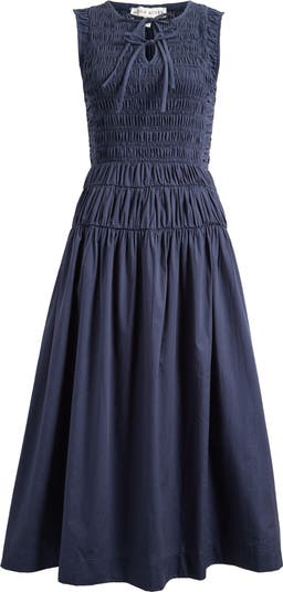Double tie-front closures bring a charming look to this cotton A-line midi dress fashioned with a smocked bodice and waistline.